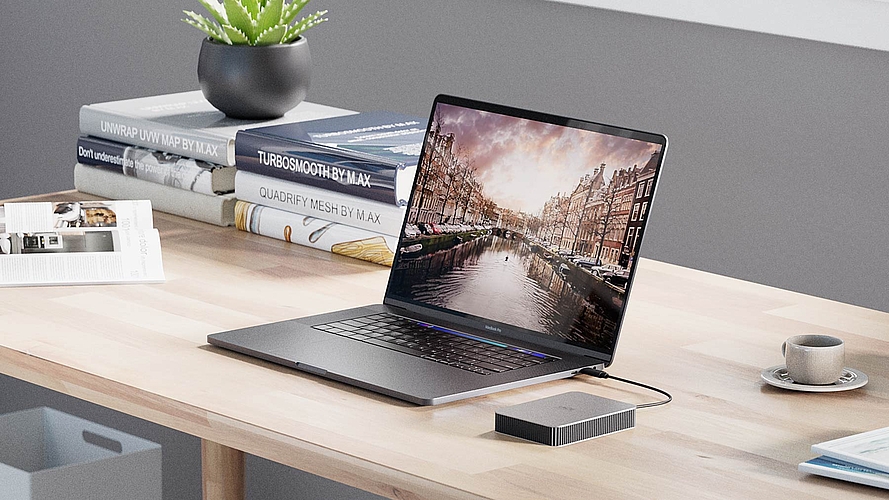 Selbstverständlich lassen sich heutzutage Ihre Daten bequem in der Cloud speichern, aber auch die konventionelle Lösung mittels Datenträger (HDD oder SSD) bringt zahlreiche Vorteile. Das externe Speichermedium kann ganz einfach mit dem Gerät verbunden werden und ist auch ohne High-Speed-Internetanbindung sofort vollständig einsatzbereit. Apropos externes Speichermedium: Das LaCie Mobile Drive setzt nicht nur optisch auf dem Schreibtisch Akzente, es punktet auch beim wichtigen Thema Nachhaltigkeit, denn es wird aus recycelten Werkstoffen gefertigt.